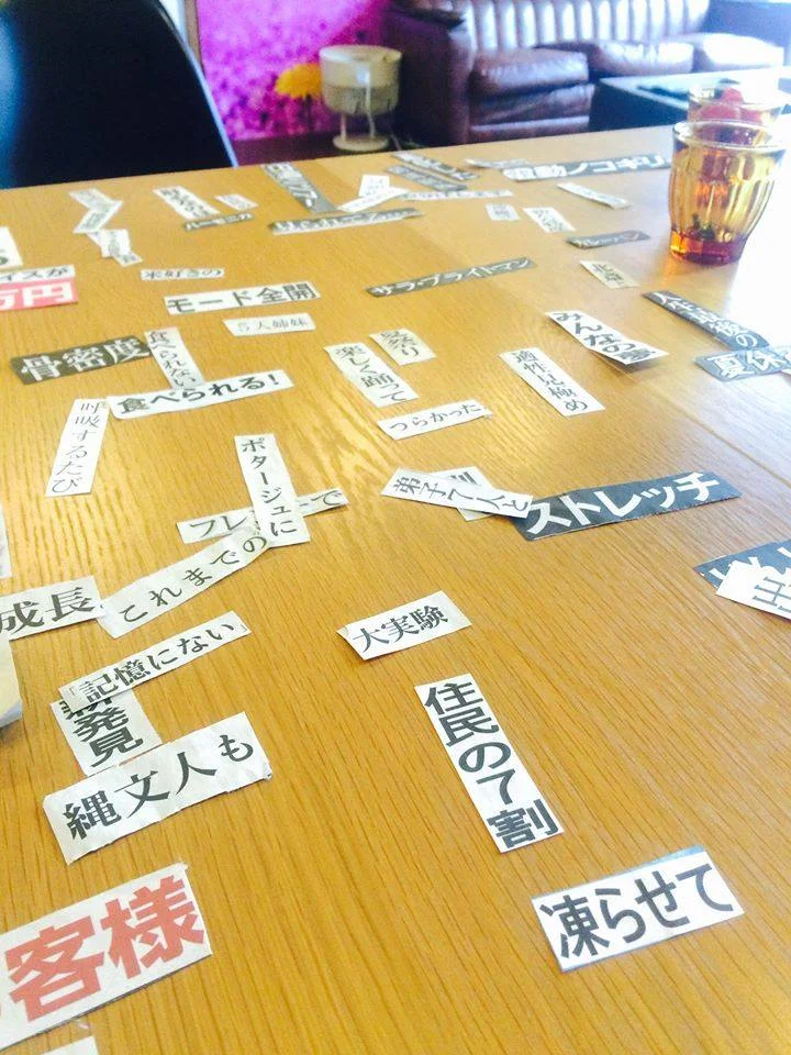 新聞の見出しやチラシから、五文字と七文字を切りぬき、自由に組み合わせ、川柳っぽく並べて遊びます。